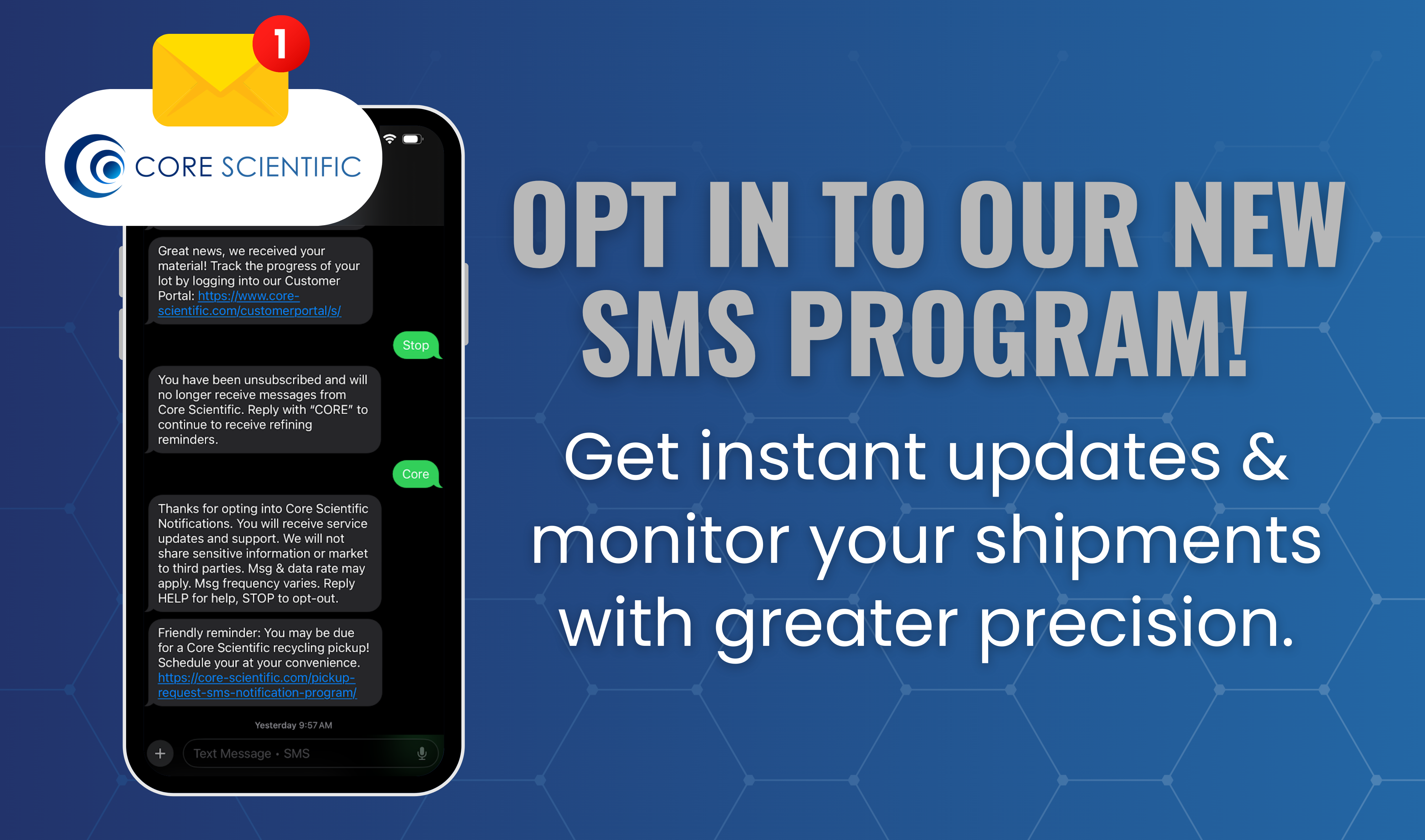 At Core Scientific, trust and transparency are essential in every interaction we have with our customers. Managing your precious metal scrap should be simple, secure, and stress-free, and that’s exactly what our SMS Notification Program delivers.
